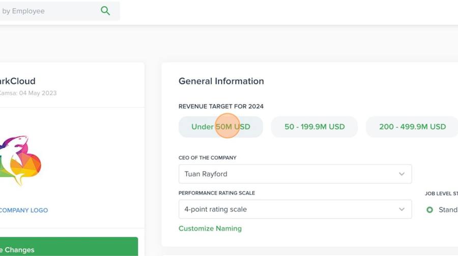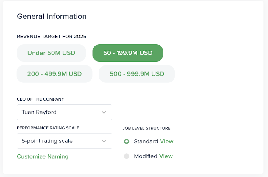The Company Profile is where you set up and manage key company-level settings, such as revenue target, compensation philosophy, job level structure, performance rating scale, integrations, and equity details.