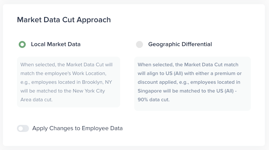You can change your Market Data Cut Approach at any time. However, before switching, we recommend exporting an Employee Data report in case you need to revert back. This report captures the prior Market Data Cuts for each employee.