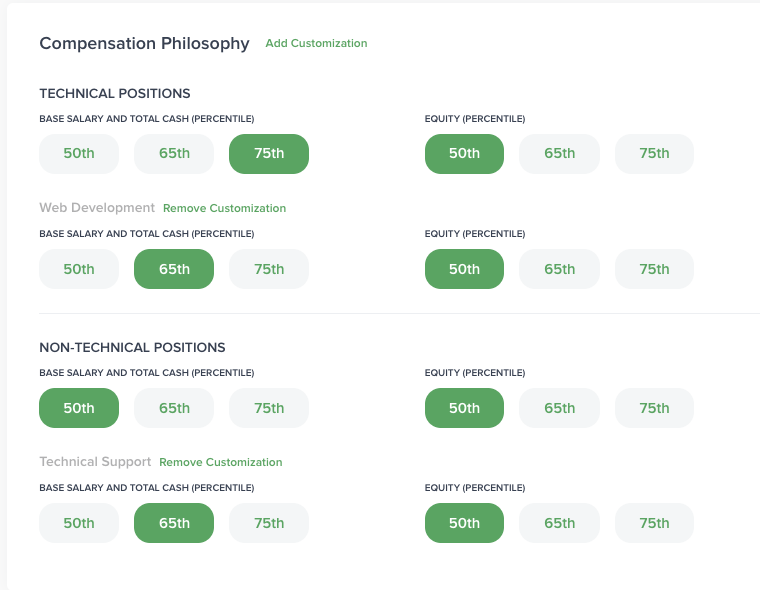 Here you can edit your target percentiles for Technical and Non-Technical jobs. These settings drive what’s shown in the Market Compensation page for your company.