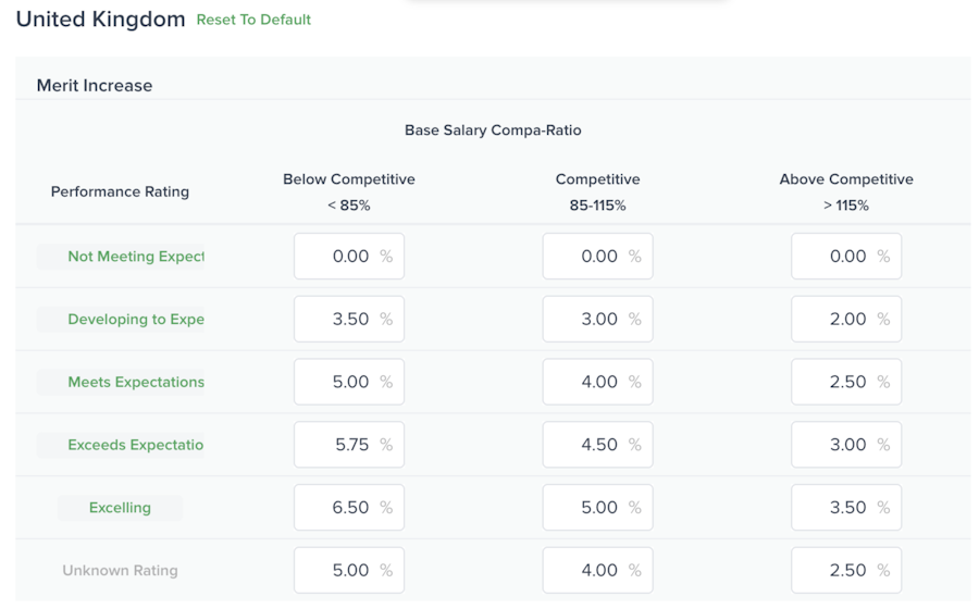 Kamsa uses Merit Increase Guidelines to calculate both the salary increase recommendations and the total salary increase budget during a Comp Review. These guidelines are based on each employee’s country, compa-ratio, and, if provided, performance rating.