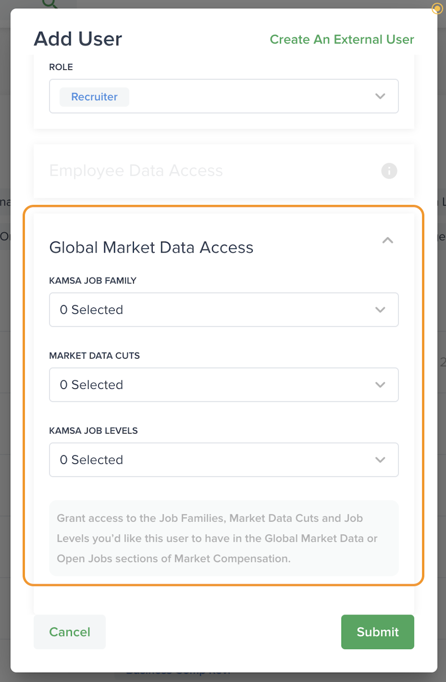 When Roles have access to Kamsa's Global Market Data, you'll be asked to define the User's Global Market Data Access.